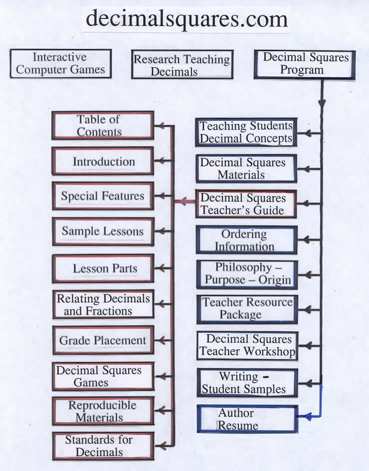 Place a transparency of the following partial outline of three of the five major files from decimalsquares.com on the overhead. Note that this site has resources for teachers and eight challenging Interactive Computer Games for students. You might mention the following highlights: One of the five major files on the Home Page (outlined in blue) contains extensive details on the Decimal Squares Program
