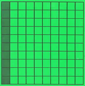 | Discuss the following: (a) Decimals for the red squares have only one place because the number of shaded parts is a single digit number. Ask people to count by tenths . . . .9 and put a red square for .9 on the overhead to show that the next number after .9 when counting by tenths is 1.0 for a whole square and zero tenths. Discuss the tendency for students to write .10 following .9 but that the squares can be used to show that .10 is equal to .1 by using squares with 10 shaded parts out of 100 and 1 shaded part out of 10. |