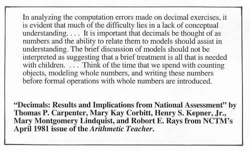 | Point out that we have seen examples of games and activities that involved the concepts of equality and inequality and which did not require the use of decimal symbolism. Discuss the need for these types of activities to develop conceptual understanding before symbols and rules are introduced. Then place the following transparency on the overhead which calls for the use of models for teaching rational numbers. | ||||||||||||||||||||||||||