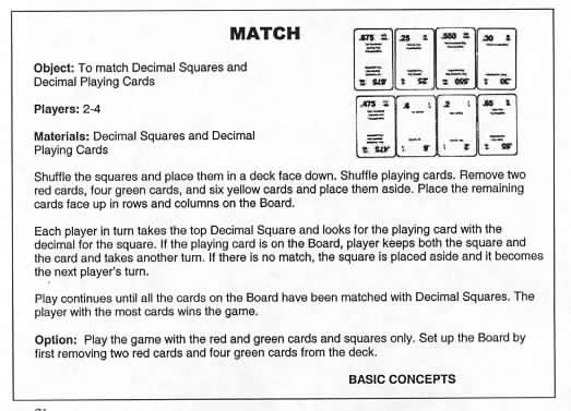 (1) Squares to Decimals Each person selects a square finds its playing card and writes its fraction; (2) Decimals to Squares Each person selects a playing card and then writes a description of its square. |