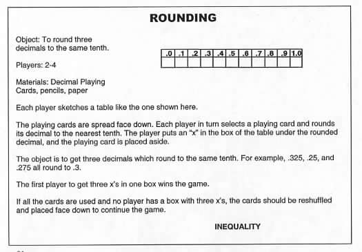 | Another possibility for the preceding activity is to use a transparency of Blank Decimal Squares (see below) and have volunteers illustrate and explain the rounding of decimals. The squares can be used to illustrate rounding to the nearest whole number nearest tenth or nearest hundredth. | ||||||||||||||||||